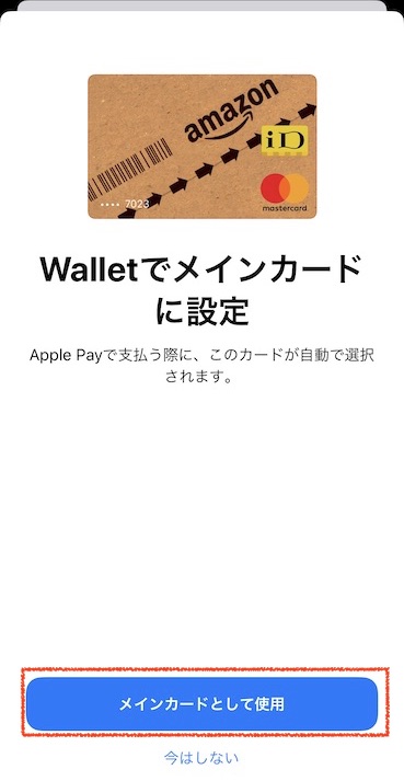 登録したクレジットカードをメインカード(サイドボタンをダブルクリックした時に、初めに表示されるカード)として利用したい場合は、続けて「メインカードとして利用」をタップしましょう。